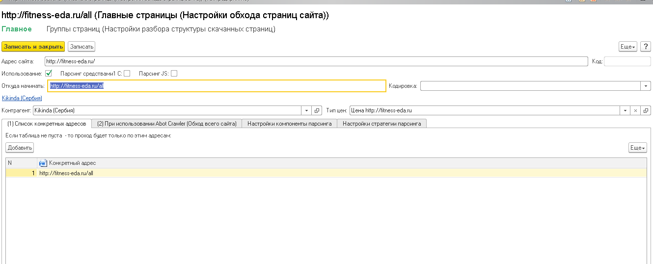 Проанализируем сайт. Чтобы получить все цены на товары нам достаточно будет считать только страничку - http://fitness-eda.ru/all. Добавим этот адрес в список конкретных адресов, т.о. парсер не будет проходить по всему сайту, а считает только один этот адрес.