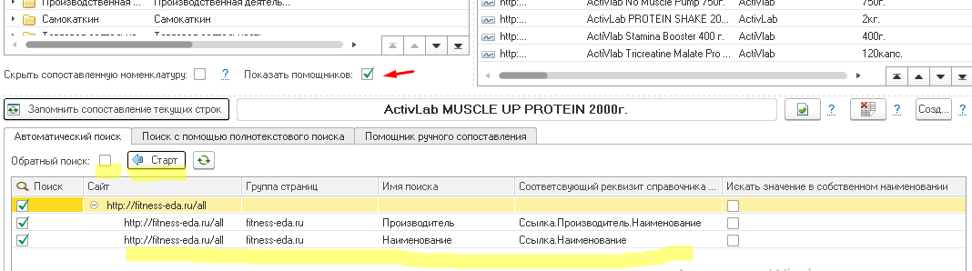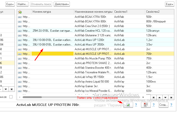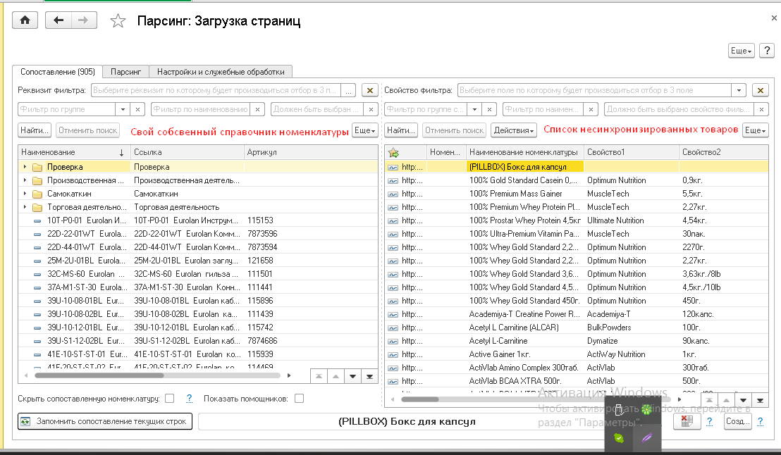 Следующий этап - необходимо сопоставить считанную номенклатуру с сайта со своей собственной. Сопоставление запоминается и при последующих считываниях по сопоставленной номенклатуре создаётся документ "Установка цен конкурентов" (в зависимости от конфигурации он может по разному называться). Сопоставленная номенклатура больше не попадает в регистр несинхронизированных.