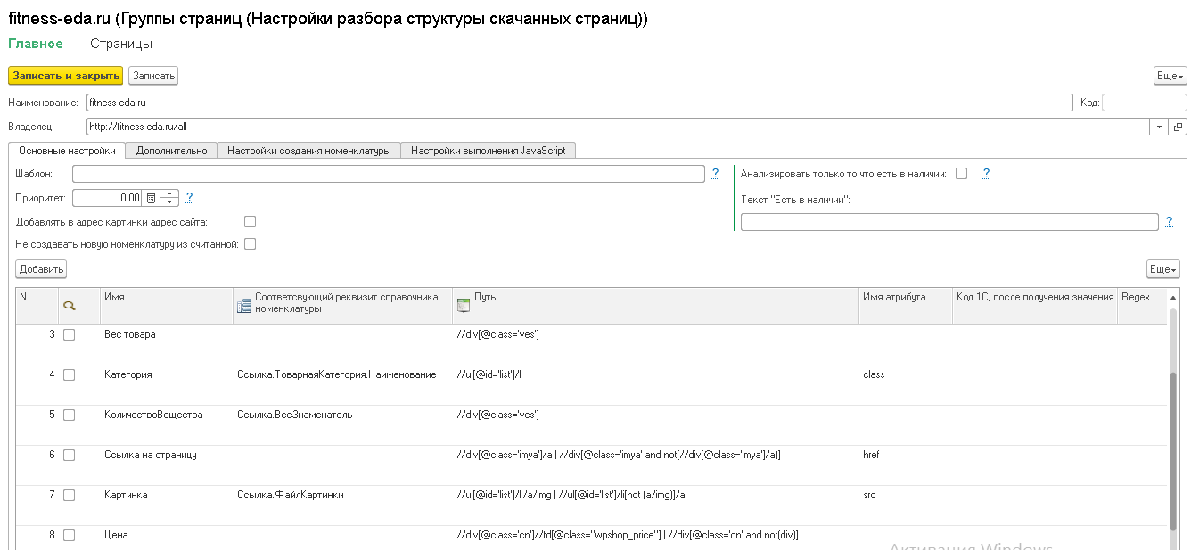 Для прохода сайта больше никаких настроек не требуется - запишем элемент справочника. Теперь определим настройки для разбора скачанной странички, для этого перейдем в подчиненный справочник "Группы страниц". Создадим элемент справоника "Группы страниц" и начнём прописывать пути xpath до нужных нам значений.