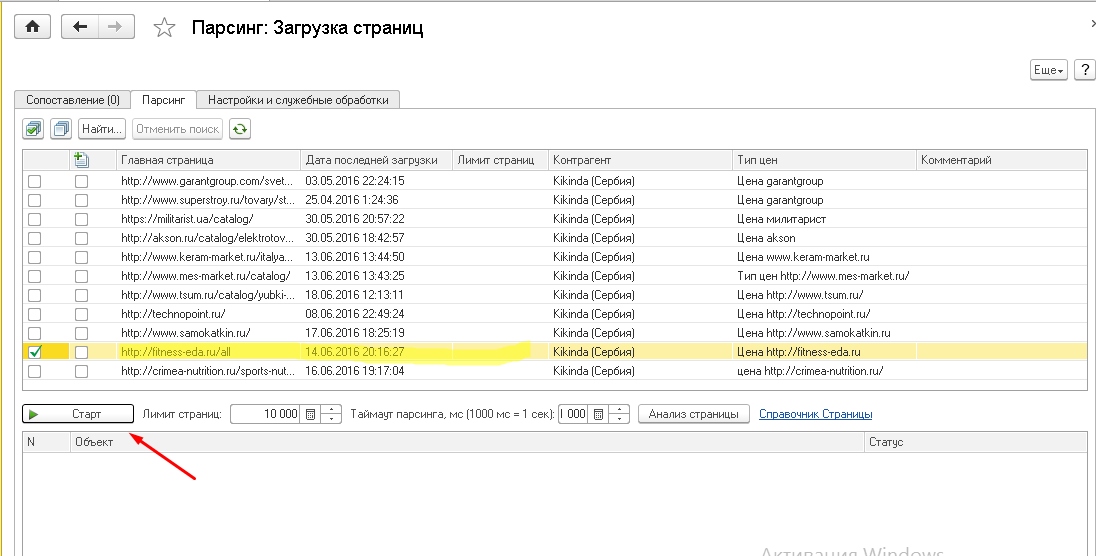Сохраняем, записываем, переходим в обработку "Загрузка страниц" на вкладку "Парсинг", отмечаем галочкой нужный нам сайт и нажимаем "Старт".